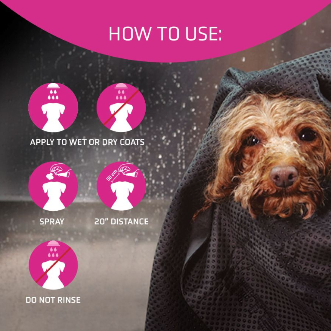 - Sprühen Sie das Produkt aus ca. 25 cm Entfernung gleichmäßig auf das feuchte Fell.