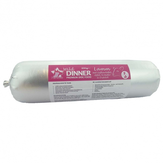 Wild Dinner Gourmet-Wurst - das Premium-Nassfutter für Ihren Hund nach 100% Lebensmittelstandard.Herkömmliches Nassfutter wird oft mit diversen minderwertigen Inhaltsstoffen und Zusätzen hergestellt, die sich schädlich auf die Gesundheit Ihres Hundes auswirken können. Aus diesem Grund verzichten wir kosequent auf tierische Nebenerzeugnisse, Schlachtabfälle und Fleischmehle sowie Künstliche Konservierungs-, Aroma- und Farbstoffe. Bei den Wild Dinner Gourmet-Würsten wird auf einen sehr hohen Fleischanteil (mindestens 90%) sowie weitere hochqualitative und gut verdauliche Inhaltsstoffe gesetzt. Außerdem sind alle Sorten komplett frei von glutenhaltigem Getreide. Stattdessen setzen wir auf hochwertige Alternativen wie Hokkaido, Amaranth, Süßkartoffel, Hirse oder Reis.Die Gourmet-Würste werden in schonender Dampfgarung in Deutschland zubereitet. In jeder Sorte wird ausschließlich eine Fleischquelle verwendet, sodass die Produkte nicht nur für Hunde mit Futtermittel-Allergien bestens geeignet sind, sondern auch zur Ausschluss-Diät verwendet werden können.Durch die schnittfeste Konsistenz lassen sie sich nicht nur perfekt portionieren, sondern auch sehr gut als Snack verwenden. So lässt sich die Futtermenge auch während intensiven Trainings-Phasen einfach im Blick behalten.In der Wild Dinner Gourmet-Wurst Lamm mit Süßkartoffel sind 90% Fleisch und Innereien vom Lamm sowie Süßkartoffel, Apfel, Käuter und Distelöl verarbeitet.Alleinfuttermittel für Hunde100% LebensmittelstandardDeutsches QualitätserzeugnisExtra hoher FleischanteilSchonende Zubereitung durch DampfgarungSchnittfest zur leichten PortionierungReines NaturproduktWir verzichten konsequent auf:Künstliche Konservierungs-, Aroma- und FarbstoffeMinderwertige NebenerzeugnisseSchlachtabfälleFleischmehleZuckerFüllstoffeFütterungsempfehlung für ausgewachsene Hunde:Füttern Sie täglich pro 5 kg Körpergewicht ca. 200 g.Diese Empfehlung ist ein Richtwert. Der individuelle Bedarf richtet sich nach Rasse, Aktivität, Alter und Haltungsbedingungen.Bitte zimmerwarm füttern und immer ausreichend frisches Trinkwasser bereitstellen.Zusammensetzung:Fleisch und Innereien ausschließlich vom Lamm (90%) bestehend aus 30% Lammfleisch, 25% Lammpansen, 15% Lammleber, 12% Lammlunge, 8% Lammherzen, Süßkartoffel (5%), Apfel (2%), Kräuter (1%), Distelöl (1%), Mineralstoffe (1%)Analytische Bestandteile:Protein: 11,9 %Fettgehalt: 6,8 %Rohasche: 1,9 %Rohfaser: 1,2 %Feuchtigkeit: 77 %Ernährungsphysiologische Zusatzstoffe:Vitamin B1 2,64mg, Vitamin B2 3,96mg, Vitamin B6 2,4mg, Vitamin B12 26,4mcg, Vitamin D3 201,6 IE, Vitamin E 20,16mg, Vitamin H (Biotin) 50,4mcg, Folsäure 1,2mg, Niacinamid 13,2mg, Calcium-D-Panthothenat 11mg, Eisen 11mg, Kupfer 2,69mg, Mangan 1,7mg, Zink 21mg, Jod 0,45mg, Selen 0,07mg
