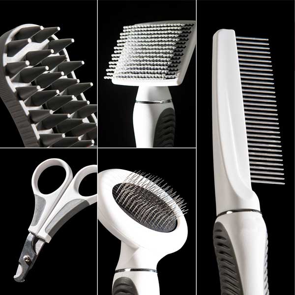 Eine regelmäßige Fellpflege sorgt dafür, dass Ihre Katze weniger Haare im Haus verliert und festigt zugleich die Bindung zwischen Ihnen und Ihrer Katze. Die Fellpflege gehört zu den schönen Momenten, die Mensch und Katze gemeinsam genießen können. Nun stehen Sie nicht mehr vor der schwierigen Entscheidung, welche Bürste Sie kaufen sollen. Dieses praktische Set enthält alles, was Sie für die tägliche Fellpflege benötigen. Enthalten im Behälter je 1x: - Feiner Kamm - Metall Zupfbürste - Nylon Zupfbürste - Gummi-Striegel - Nagelknipser mit gebogener Schneide Feiner Pflegekamm: Mit diesem einfachen Kamm werden Schuppen sowie andere kleine Schmutzpartikel entfernt. So bleibt die Haut Ihrer Katze schön sauber. Zusätzlich werden lose Haare entfernt, bevor es zu Verfilzungen kommen kann. Der kleine Pflegekamm eignet sich insbesondere für empfindliche Bereiche wie Hals, Kopf und Hinterteil, bei denen die Pflege mit einer normalen Bürste schwierig ist. Zupfbürste aus Metall: Diese einfache Bürste entfernt lose Haare sowie Schuppen und entwirrt einfache Knoten. Dabei wird die Haut sanft stimuliert. Die langen Stifte reichen bis in die tiefer liegenden Schichten des Fells Ihrer Katze und gewährleisten so ein gründliches Bürsten. Zupfbürste aus Nylon: Die Zupfbürste aus Nylon entfernt Knötchen und macht dabei das Fell Ihrer Katze schön weich. Die Bürste kann sogar für sehr flauschige Katzen verwendet werden, denn auch durch dichtes Fell kommt sie spielend leicht. Gummi-Striegel: Der Gummi-Striegel entfernt lose Haare bei gleichzeitiger Massage – ganz ähnlich wie wenn die Katzenmutter das Fell ihrer Jungen leckt. Die Bürste passt genau in Ihre Handfläche und hilft Ihrer Katze dabei, sich zu entspannen. Dies macht die Bürste zum idealen Werkzeug, um mit der Fellpflege zu beginnen. Nagelknipser mit gebogener Schneide: Dieses hochwertige Werkzeug hilft Ihnen dabei, die Krallen Ihrer Katze im Handumdrehen zu kürzen. Bitte seien Sie beim Knipsen der Krallen Ihrer Katze vorsichtig. Schneiden Sie nicht in den durchbluteten Bereich der Kralle, da dies den Nerv beschädigen kann. Praktischer Vorratsbehälter Die Pflegewerkzeuge werden aufrecht in einem praktischen Behälter aufbewahrt. So werden die Kammzähne nicht beschädigt. Außerdem können im Deckel des Behälters ganz praktisch lose Katzenhaare aufbewahrt werden. Dies erspart Ihnen viele Gänge zum Abfalleimer. Maße: ca. 24 x 13,8 x 13,8 cm
