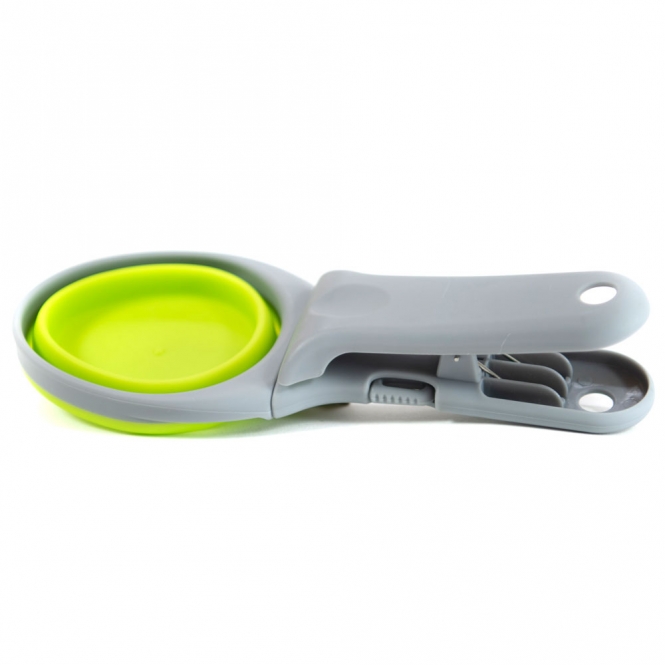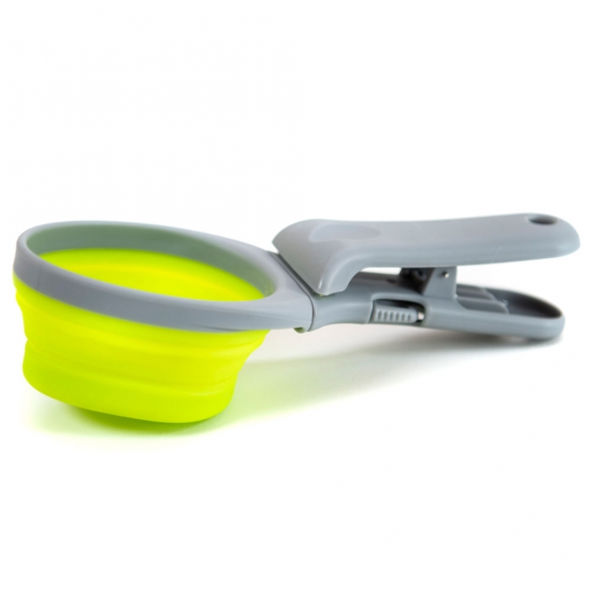 Es handelt sich um eine zusammenfaltbare Futterschaufel, bei der das Futterreservoire aus hygienischem Silikon besteht. Der ergonomisch geformte Griff lässt sich vom Futterreservoire abnehmen und kann als praktische Verschlussklammer z.B. für den Futtersack verwendet werden.