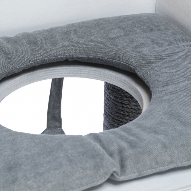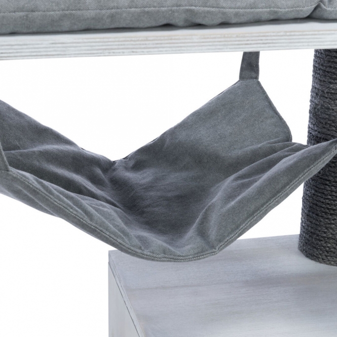 Der Trixie Kratzbaum mit Regalfunktion besteht aus lackiertem Sperrholz, das Stabilität und eine elegante Oberfläche bietet. Die Kratzstämme sind mit 5 mm starkem Sisal umwickelt – ideal, damit deine Katze ihre Krallen ausgiebig schärfen kann. Die Liegeflächen, das Kissen und die Hängematte sind aus pflegeleichtem Canvas und Polyester gefertigt und bei Bedarf per Handwäsche leicht zu reinigen.
